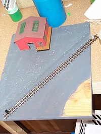 Hie sieht man, dass auch einfachen Mitteln sowas gebaut werden kann, ein Regalboden, ein N-Gebäude, Baum und Streumaterial aus der Restekiste, Fleisch-Spieße (Bahnsteig) und Schaschlik-Spieße (Straßenpfosten) aus dem Restpostenmarkt, feines Schleifpapier (Straße)…. uns los geht's :-)